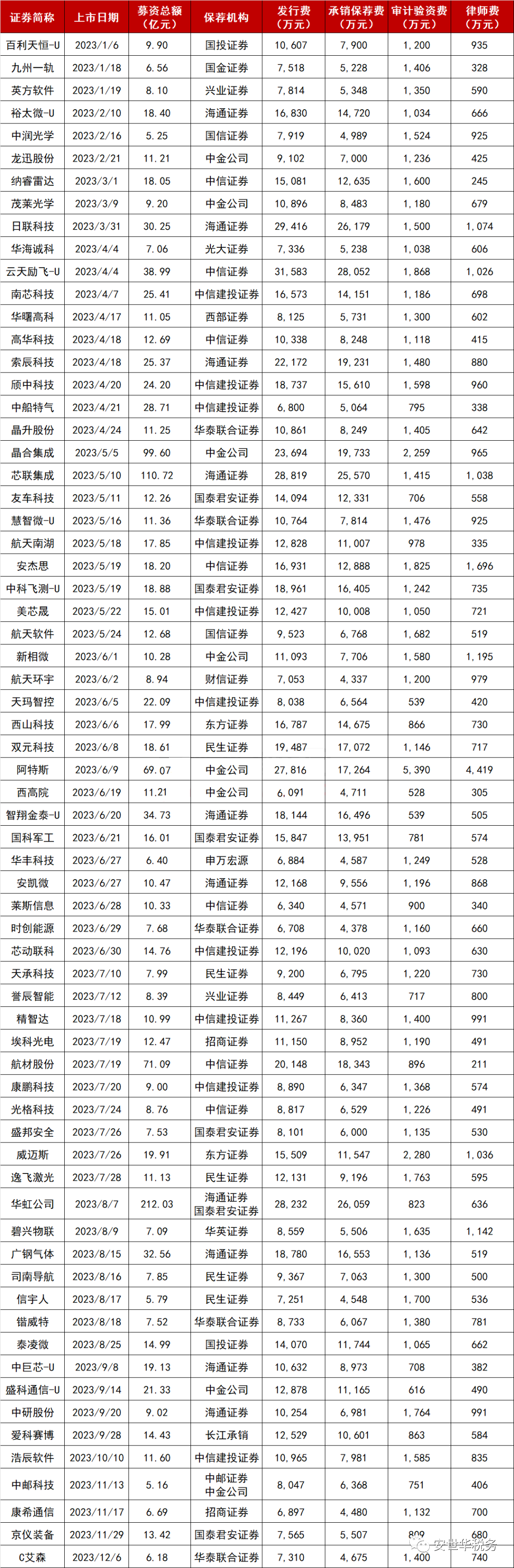 以下是2023年以来科创板IPO上市公司的发行费用明细: