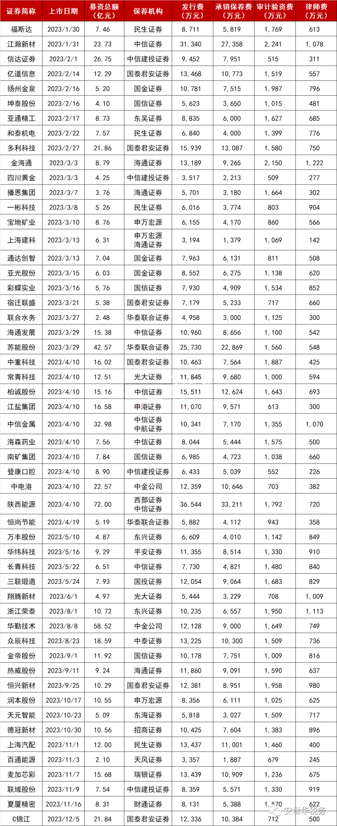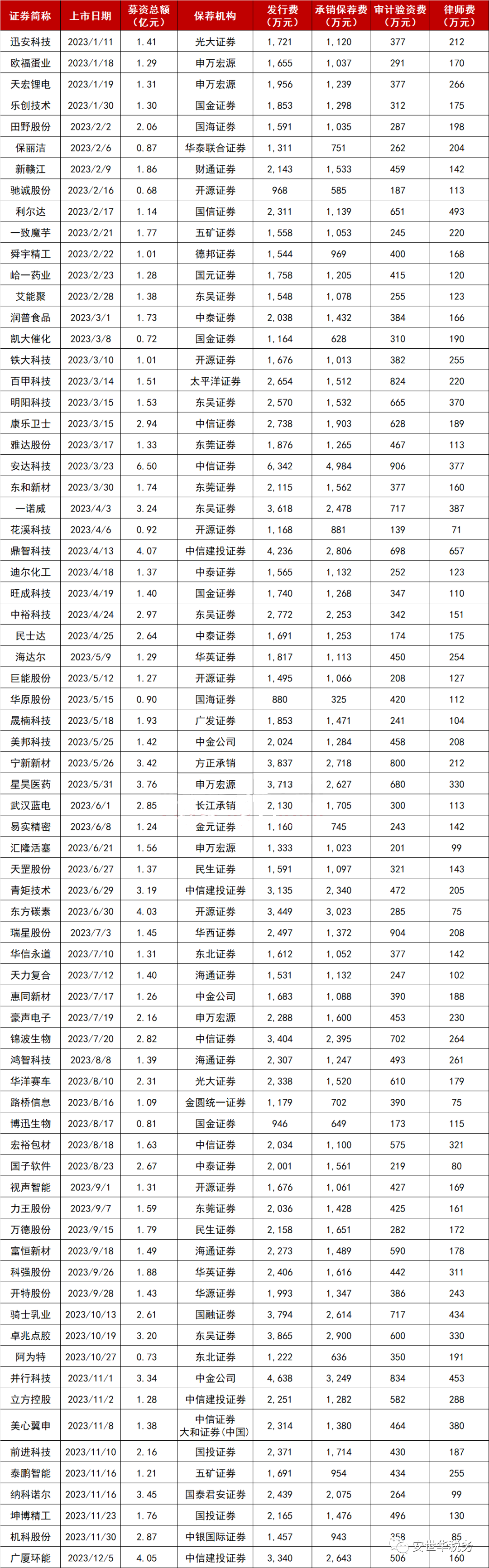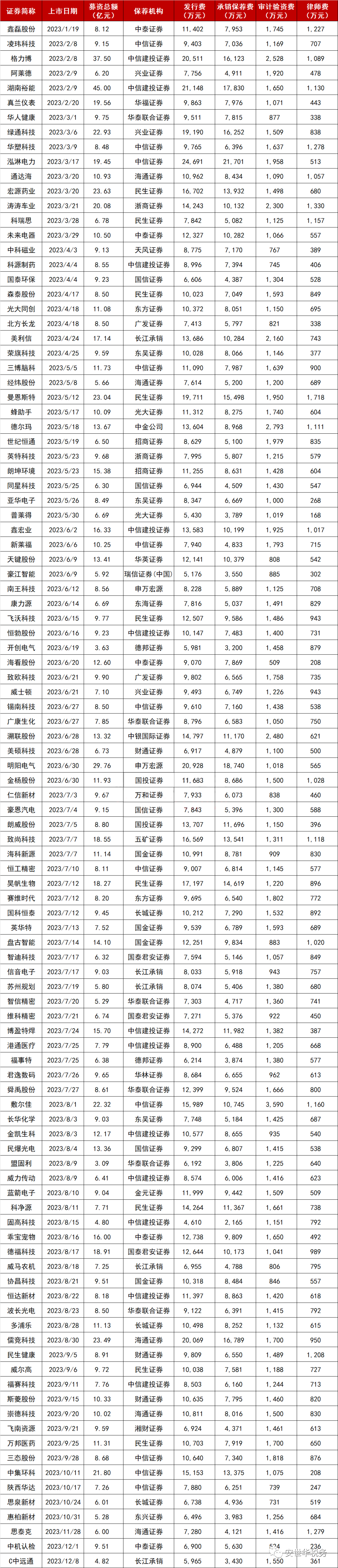 以下是2023年以来沪深主板IPO上市公司的发行费用明细:
