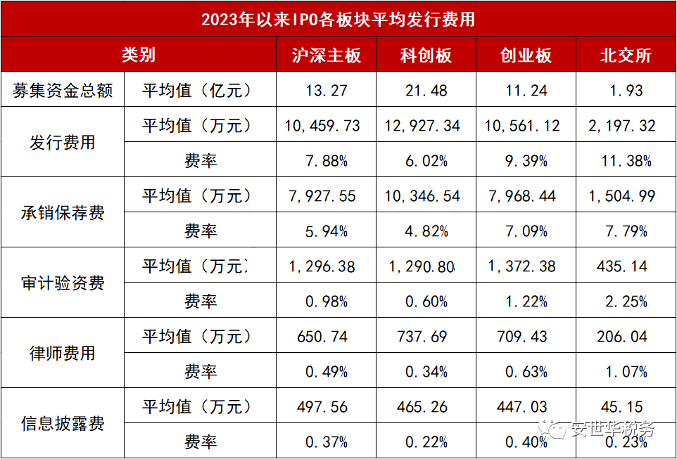 2023年以来A股各板块的IPO平均各项发行费用如下: