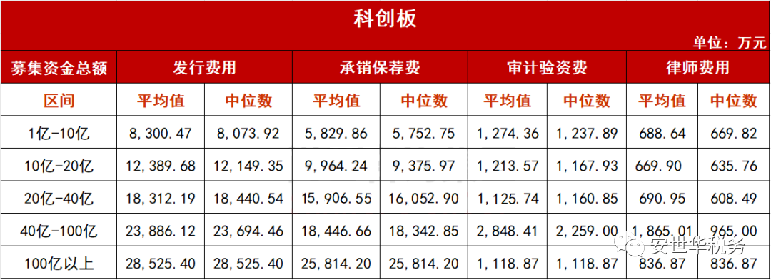 科创板:平均发行总费用12,927.34万元、费率6.02%。承销保荐费10,346.54万元、费率4.82%;审计验资费1,290.80万元、费率0.60%;律师费用737.69万元、费率0.34%;信息披露费465.26万元、费率0.22%。